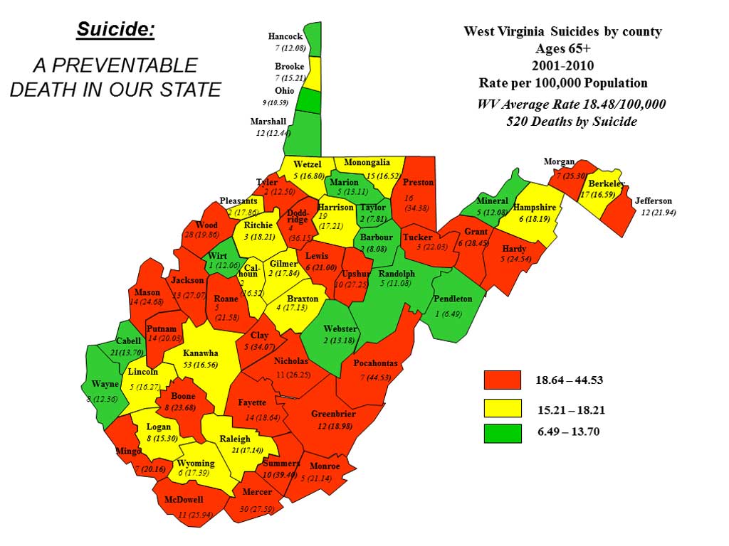 West Virginia Suicides by County, 2001-2010, Ages 65+